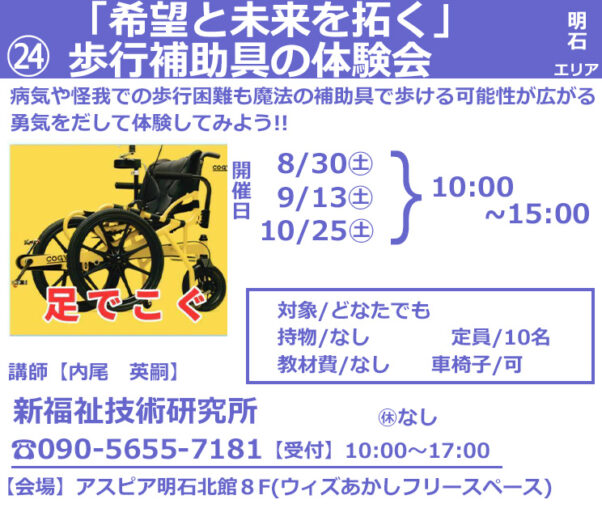 イベント詳細 このイベントは 30 8月 2025 から 25 10月 2025 まで開催しています。 次回の開催は 2025年10月25日 10:00 です。 会場: ウィズあかし カテゴリ: 健康, 第3回明石まちゼミ タグ: 明石まちゼミ 開催日: 2025年10月25日 10:00 – 15:00 病気や怪我での歩行困難も魔法の補助具で歩ける可能性が広がる勇気をだして体験してみよう!!