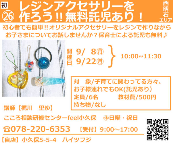 イベント詳細 このイベントは22 9月 2025に終了しました 会場: こころ相談研修センターfeel小久保 カテゴリ: 作る, 第3回明石まちゼミ タグ: 明石まちゼミ 初心者でも簡単!!オリジナルアクセサリーをレジンで作りながら お子さまについてお話しませんか?保育士による託児も無料♪