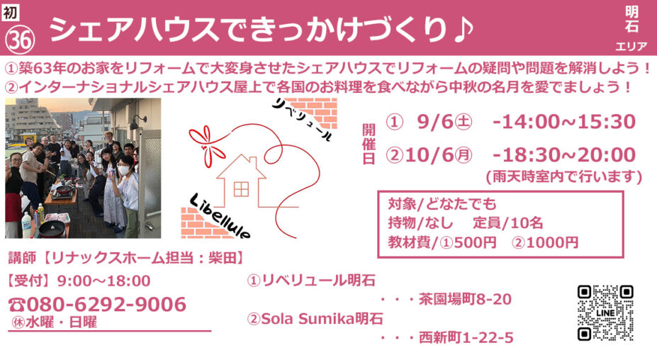 イベント詳細 日付: 2025年10月6日 18:30 – 20:00 カテゴリ: 第3回明石まちゼミ, 食べる タグ: 明石まちゼミ ①築63年のお家をリフォームで大変身させたシェアハウスでリフォームの疑問や問題を解消しよう! ②インターナショナルシェアハウス屋上で各国のお料理を食べながら中秋の名月を愛でましょう!